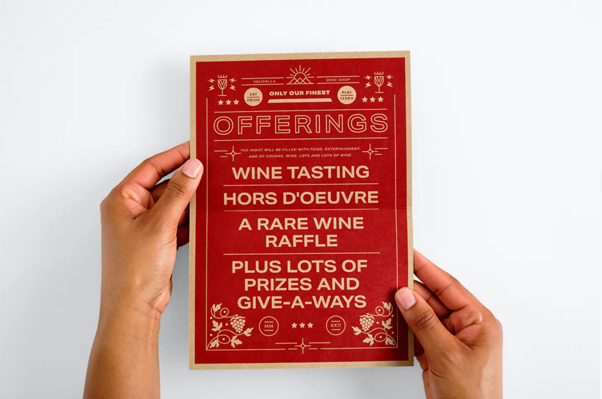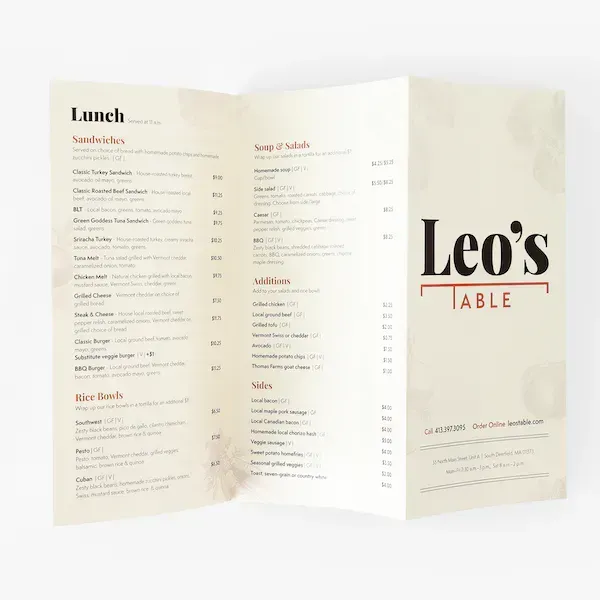Cree una receta para el éxito con el marketing impreso para su restaurante. Utilice los servicios de impresión en línea de MizaniDesign para anunciar con folletos personalizados y correo directo, encontrar la plantilla de menú adecuada, promocionar ofertas especiales y eventos con carteles interiores y exteriores y completar la experiencia gastronómica con arte mural digno de sorprender.