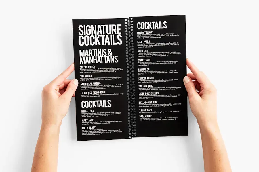 Protéjase contra derrames y resista el desgaste del restaurante con menús impermeables. Impreso en un sustrato sintético impermeable que se limpia fácilmente, nuestro proceso de impresión de menús a prueba de agua hace que los detalles de su cena y las marcas comerciales de comida para llevar se vean deliciosas. Termine su menú con una capa UV para protegerlo de la humedad, agregue un pliegue o una ranura y haga que sus clientes regresen por más.